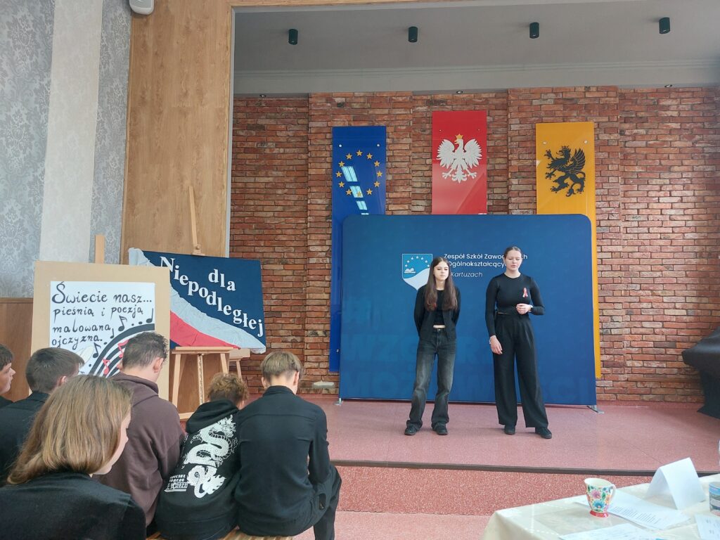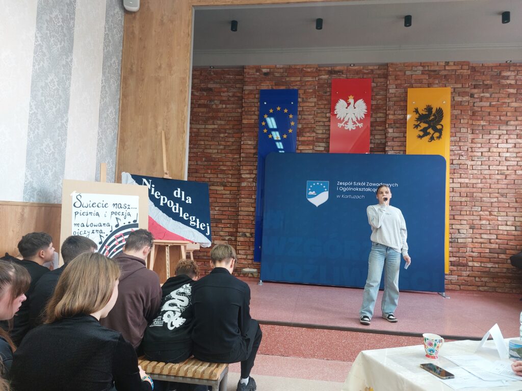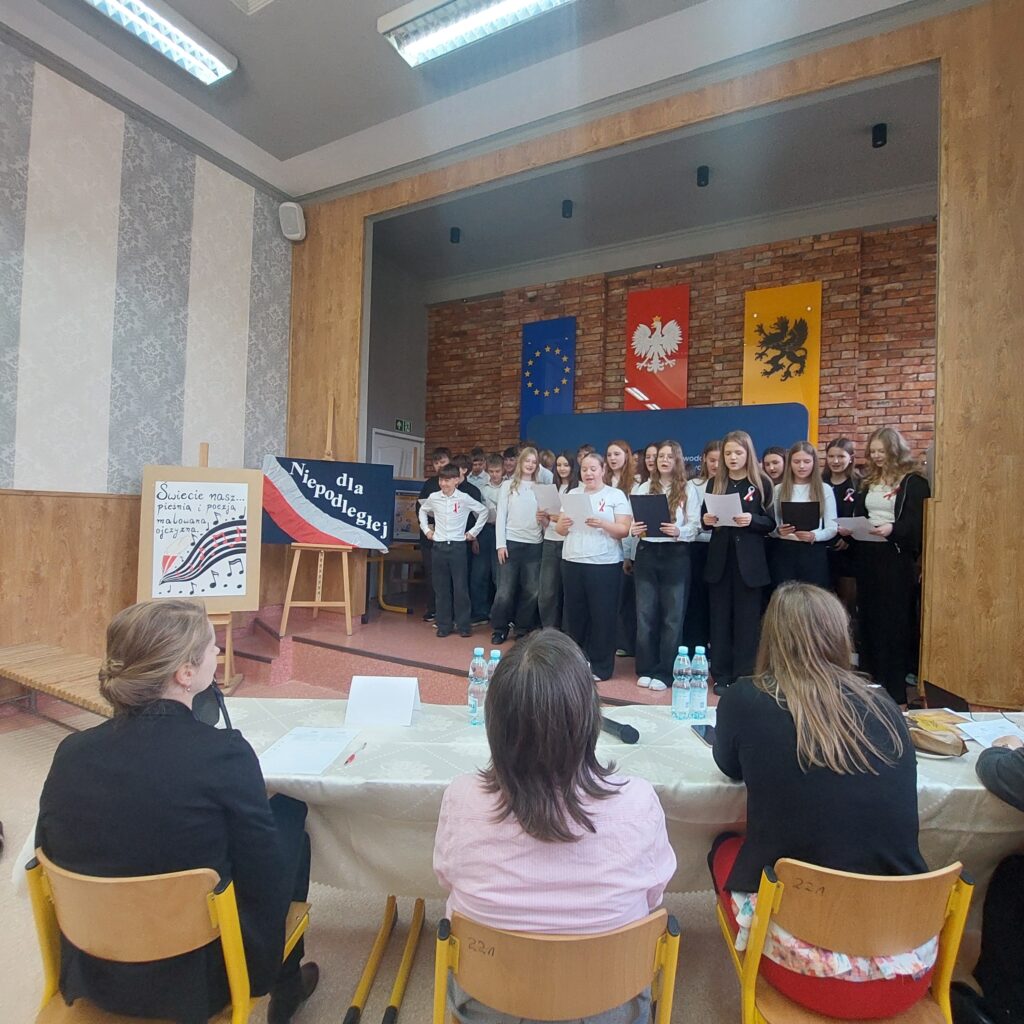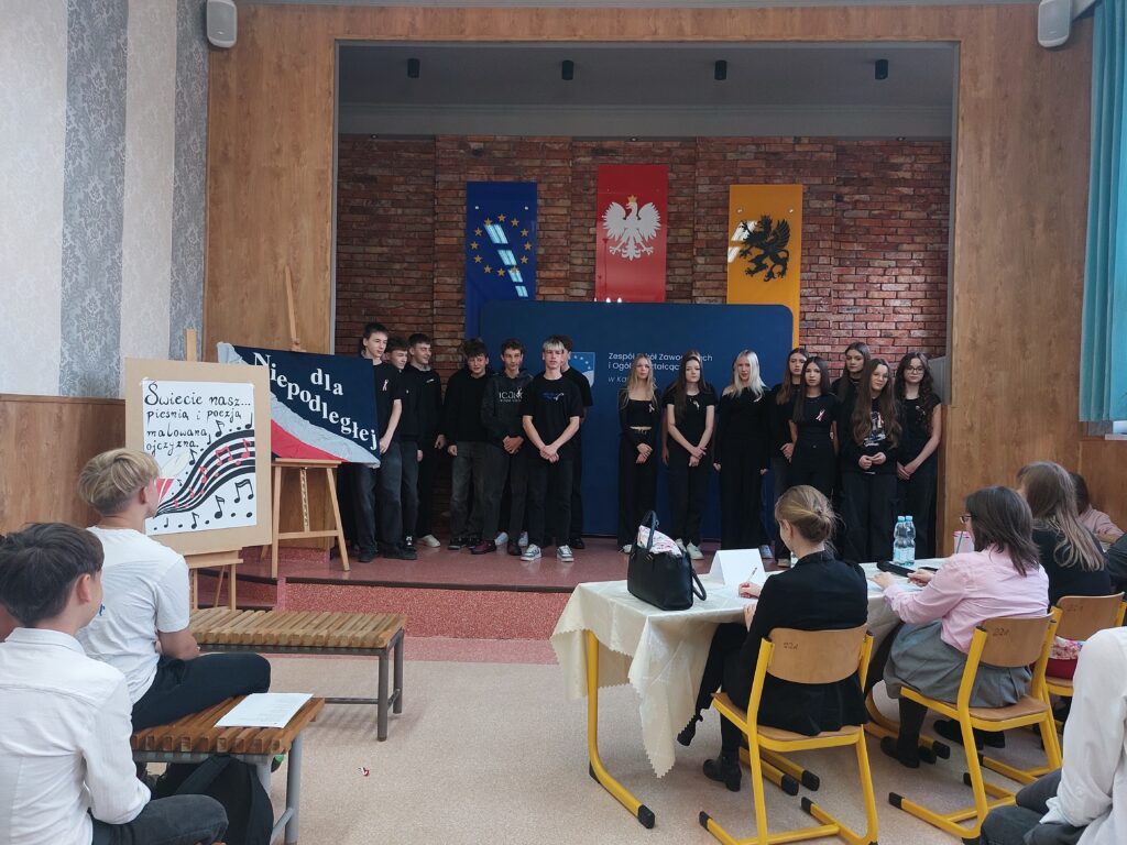W tym roku, koordynatorzy projektu, dla klas pierwszych przygotowali konkurs pod tytułem: „Świecie nasz… – pieśnią i poezją malowana Ojczyzna”. Za tę część projektu odpowiadała p. K. Konkol. Młodzież klas pierwszych miała za zadanie przygotować jedną z pieśni patriotycznych oraz utwór poetycki. Uczniowie z zaangażowaniem podeszli do zadania. Ze śpiewem na ustach wystąpiły całe klasy, dbając jednocześnie o wrażenie artystyczne. Natomiast recytacja to już indywidualne zmagania reprezentantów klas. Jury w składzie: p. M. Meisner – Kwiatkowska, p. A. Dzienisz, p. D. Kostrzewa – Rzeszewicz oraz p. J. Pobłocka przyznały miejsca:
